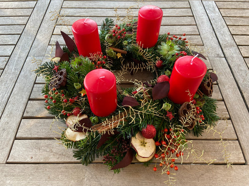 Adventkranz rot mit Apfelscheiben und Beeren